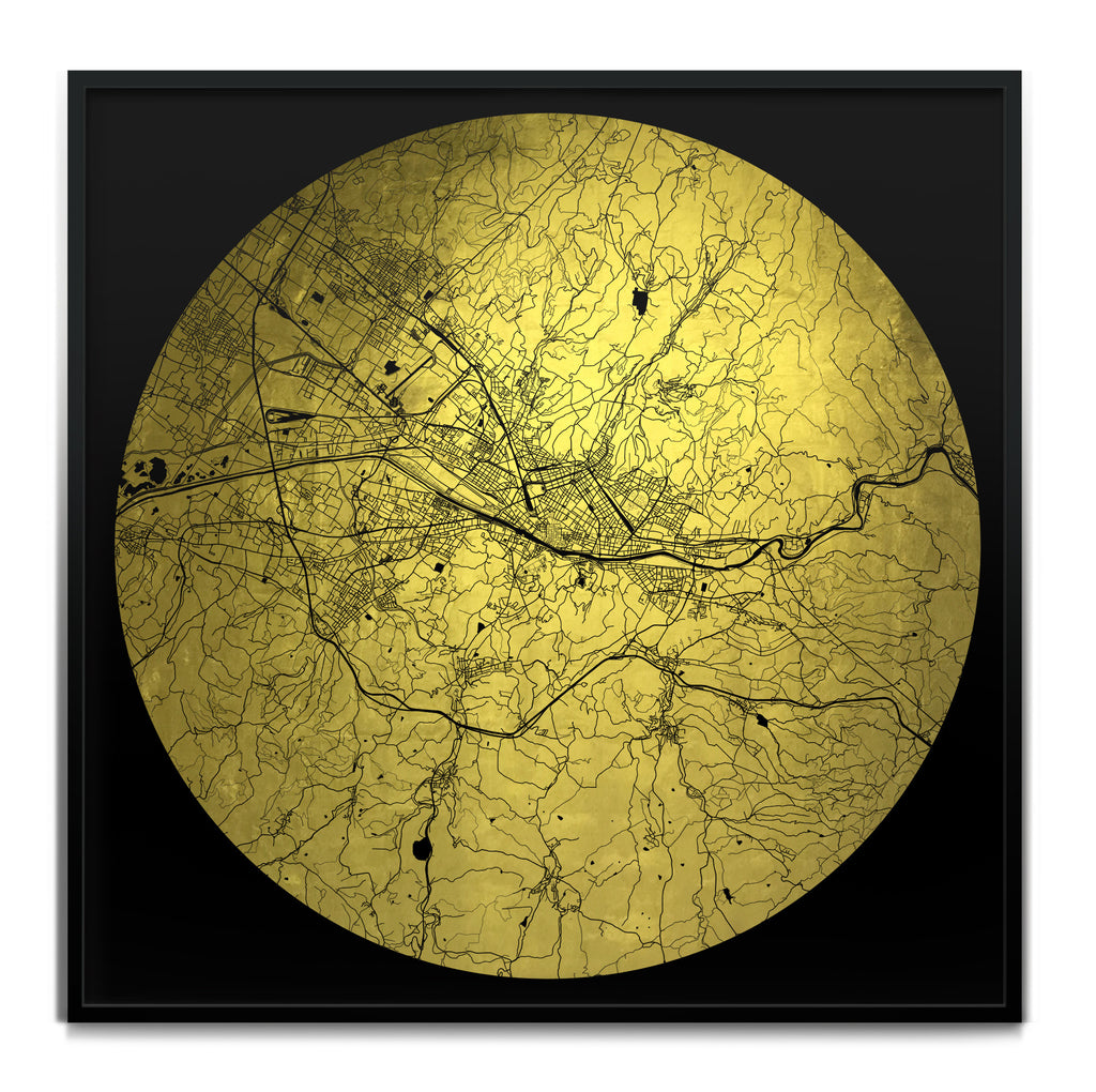 • UV treated ink on 24 karat gold leaf, gold leaf hand gilded onto 3mm aluminum composite, framed