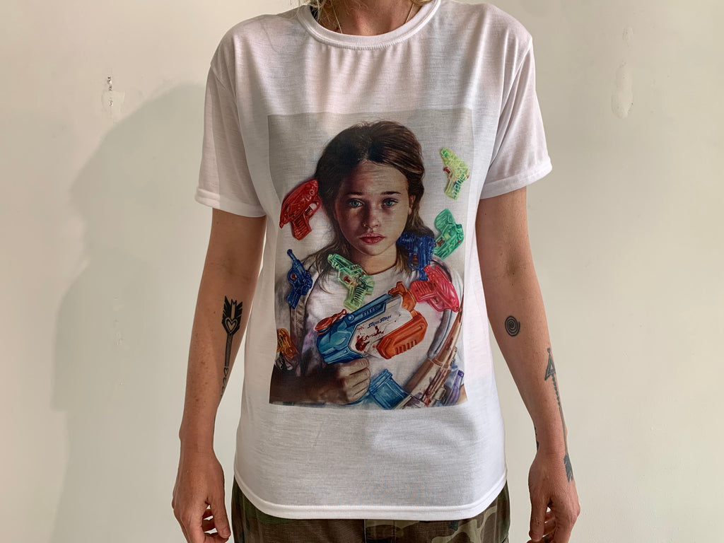 A comfortable and lightweight unisex fine art t-shirt, based on the Toy Guns painting from Art Unified artist Johan Andersson.