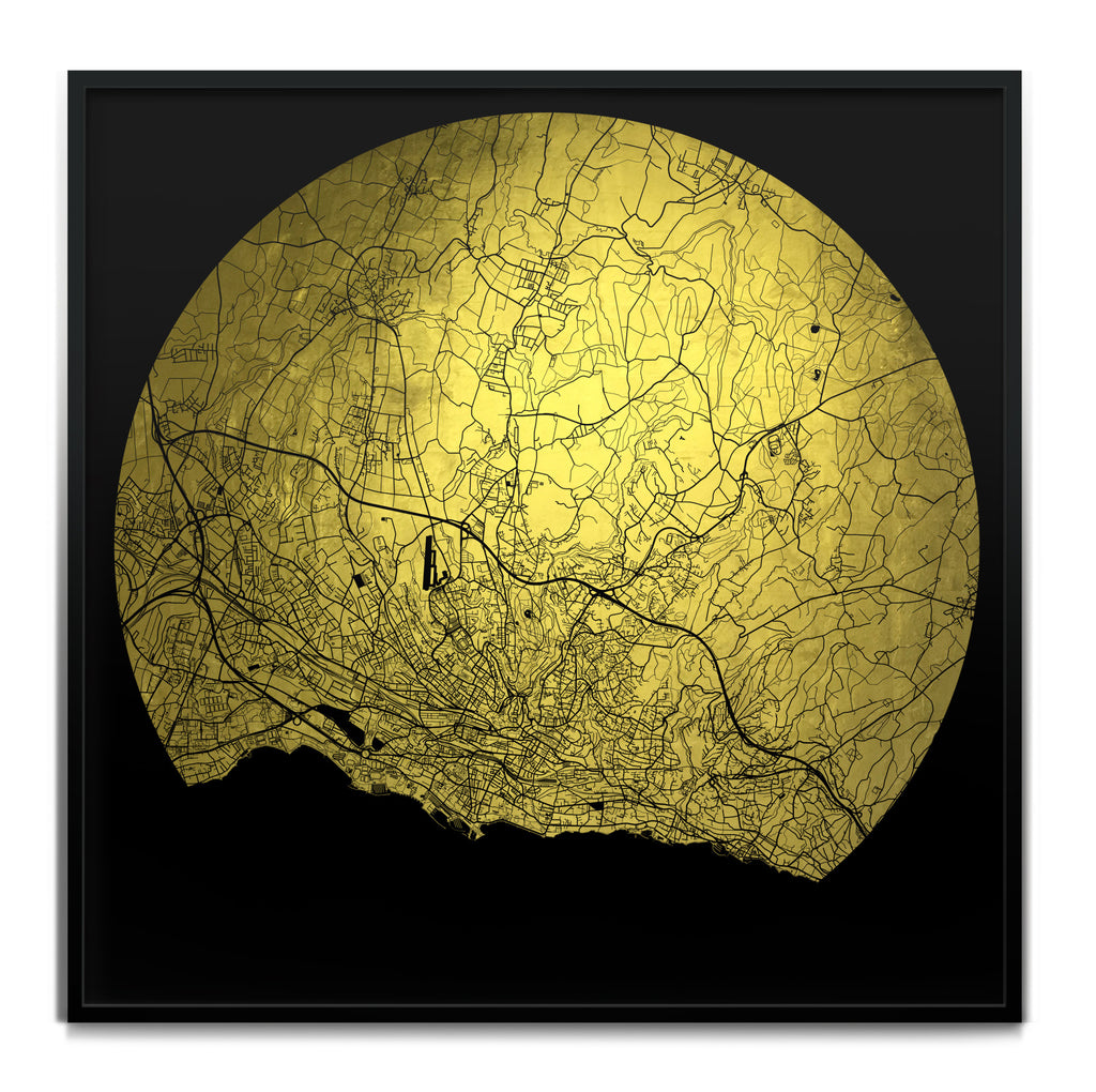 - UV treated ink on 24 karat gold leaf, gold leaf hand gilded onto 3mm aluminum composite, framed