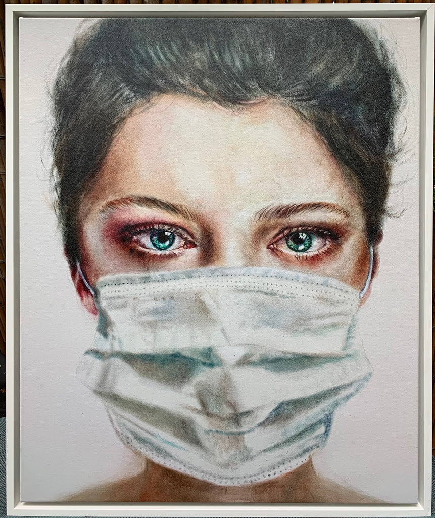 A young woman with bloodshot eyes and her mouth covered by a surgical mask echoes photographs, often selfies, of medical workers’ faces scarred by the tight bands of N95 masks and other PPE. The image immediately speaks to the present plight of health care workers fighting COVID-19