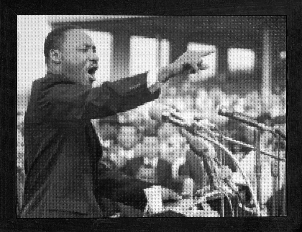 Description: This mosaic depicts Rev. Dr. Martin Luther King Jr., addressing a large audience at the Freedom Rally in Los Angeles in 1963. If you’d like to listen to the “We Want to be Free” speech that MLK delivered that day, it can be found here, on Michelle Ngome’s website.